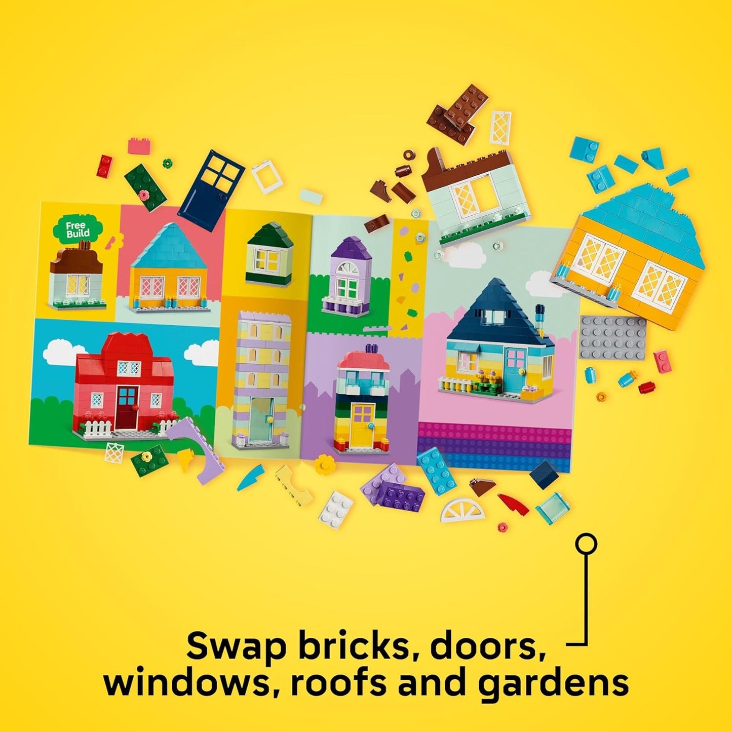LEGO® house sets – Budding architects, boys and girls aged 4+ can create, combine and customize 6 different colorful houses with the LEGO® Classic Creative Houses building toy for kids Build-a-house toy – The set inspires kids to explore creative construction by adding bricks to make houses taller and swapping doors, windows, gardens and more to create new designs of their own Endless creativity – Includes 8 ideas to kick-start free-building fun so kids can experiment with creative building Toy house building kit – The colorful set features different styles of windows, doors, trees, flowers and baseplates to maximize possibilities for personalization LEGO® house-building gift – Give this endlessly adaptable building-bricks toy as a birthday, holiday or any-day gift for any kid who enjoys hands-on creative fun 3D building instructions – Kids can use the LEGO® Builder app for an immersive building experience, with digital tools to zoom in and rotate models in 3D, save sets and track progress 850-piece LEGO® set – The blue house from the 6 initial models stands over 6 in. (15 cm) high, although houses can grow and shrink in size as much as your little builder desires Ages 4+