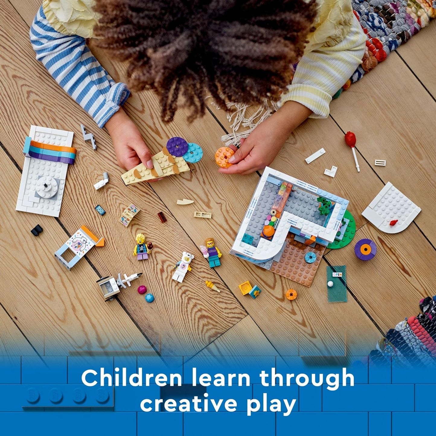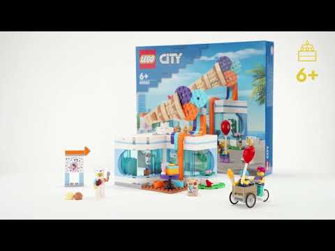 includes everything kids need to build a pretend toy Ice Cream Shop and cargo bike, plus fun accessories and 3 minifigures, including a vendor with a polar bear suit features lots of details for imaginative play, including an ice-cream stand counter, blender, fridge and an outdoor seating area 296 pieces Ages 6+