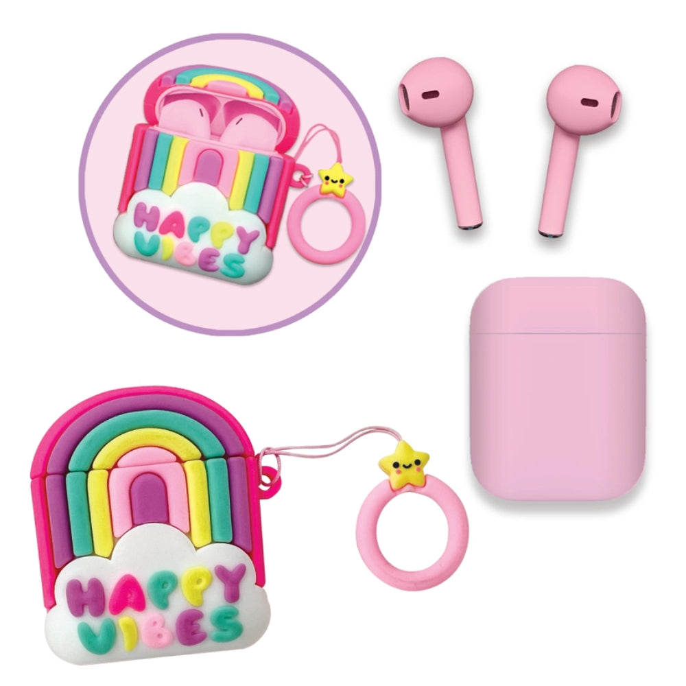 Catch up with fashion and technology with this cool set of wireless earbuds with charging case. Compatible with iPhone, Android, and Windows devices. Contains: 1 pair of wireless earbuds, 1 charging case, 1 silicone case with keychain. Ages 8+