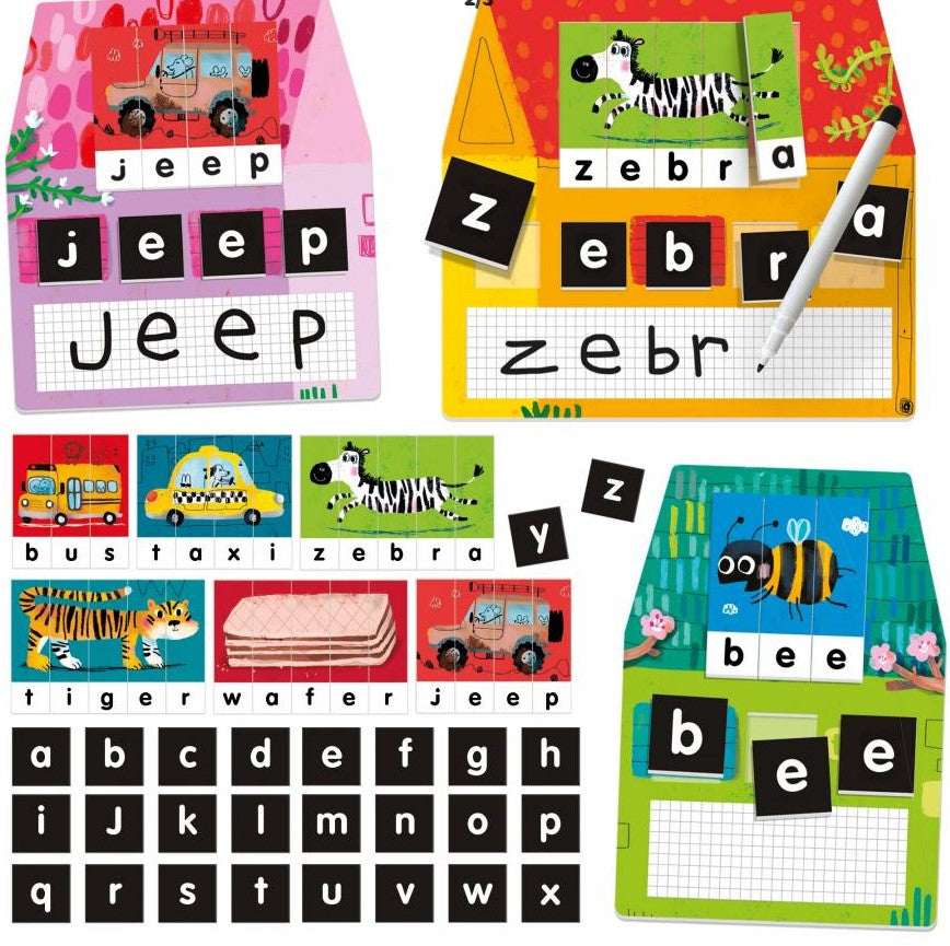 Learn to read and write in 3 ways. Children put the word puzzles together in the little houses, write words using the moveable letters then practice writing them themselves with the pen provided. The game is inspired by the Montessori three-period method. Ages 3+