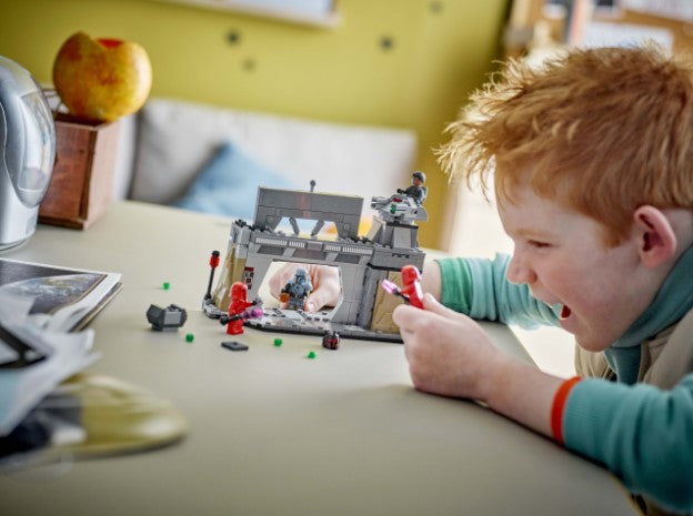New LEGO® Star Wars Paz Vizsla and Moff Gideon Battle! Includes 4 collectible minifigures, Paz Vizsla, Moff Gideon and 2 Imperial Praetorian Guards. The Mandalorian base in this set features a heavily armored door with a slam-shut trigger and control panels, plus a rotating, stud-shooting turret! Theres a brick-built heavy blaster for Paz Vizsla, a jetpack for Moff Gideon, weapons for the Praetorian Guards, plus a storage box containing a thermal detonator element. The Mandalorian base in this 289-piece set measures over 5 in. (12 cm) high, 7.5 in. (20 cm) wide and 3 in. (8 cm) deep. Ages 7