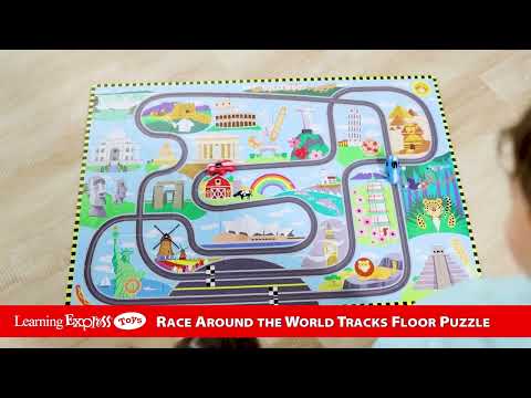 New Race Around the World Track Floor Puzzle! Piece together 48 cardboard jigsaw pieces to create a racetrack that runs through the world's most recognizable landmarks. Grooves in the pieces form a twisting, turning racetrack for 2 wind-up vehicles! Place the wind-up cars on the start lines to race and chase each other around the world. An engaging way to help kids learn about global landmarks. Hands on, screen free play that promotes fine-motor and problem-solving skills. Completed puzzle measures 3 feet by 2 feet; race cars are approximately 2.5 inches long. Ages 3 - 11