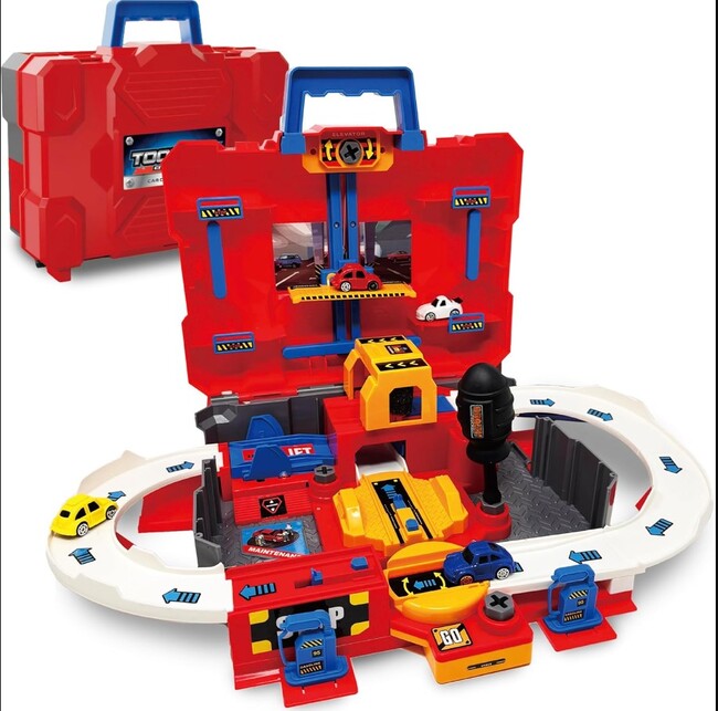 Complete Playset: Includes 4 cars, track system, car wash, elevator, parking garage, fuel station, mechanic garage, rotating lift, stickers, and more. Interactive Play: Features a dynamic track and interactive elements like a toy car wash, elevator, and mechanic garage to engage children in imaginative play. No Batteries Required: Enjoy uninterrupted playtime with this battery-free toy vehicle playset. Portable Fun: Packs neatly into a toolbox with a handle for easy transport and storage. Ages 3+